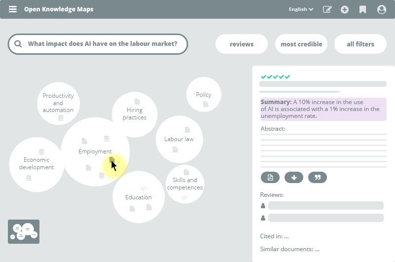 Identify relevant concepts with the help of AI: one of the most difficult tasks when you are new in a research field is to learn the “language” of the field. Open Knowledge Maps makes it easier for you by labelling research areas with relevant concepts.